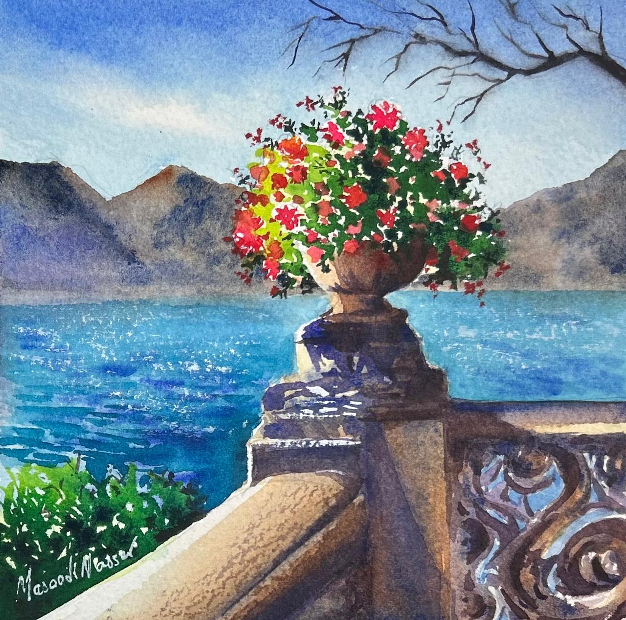 I am absolutely in love with this beautiful masterpiece that artfully captures the timeless charm of an Grecian home adorned with delightful plants and flowers.
