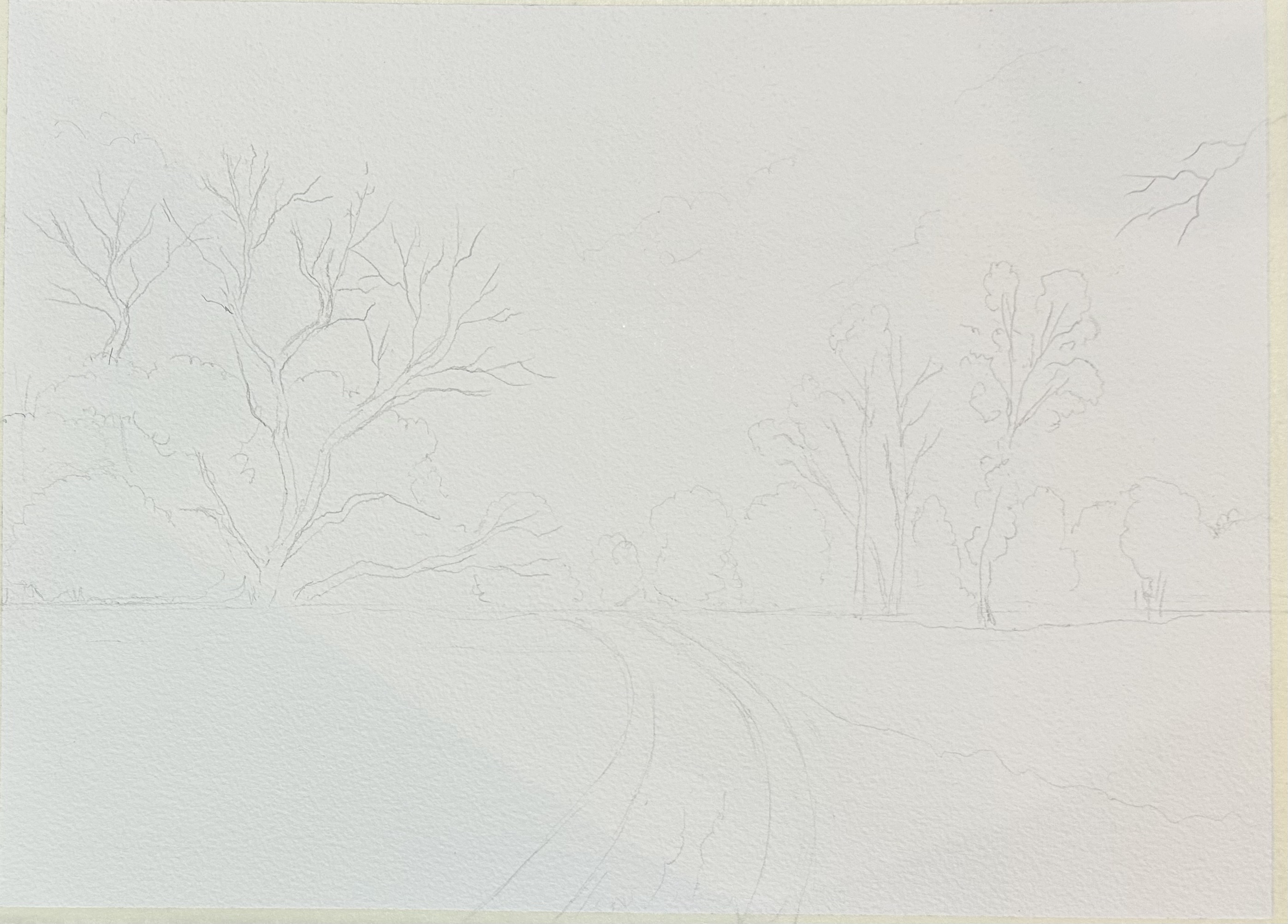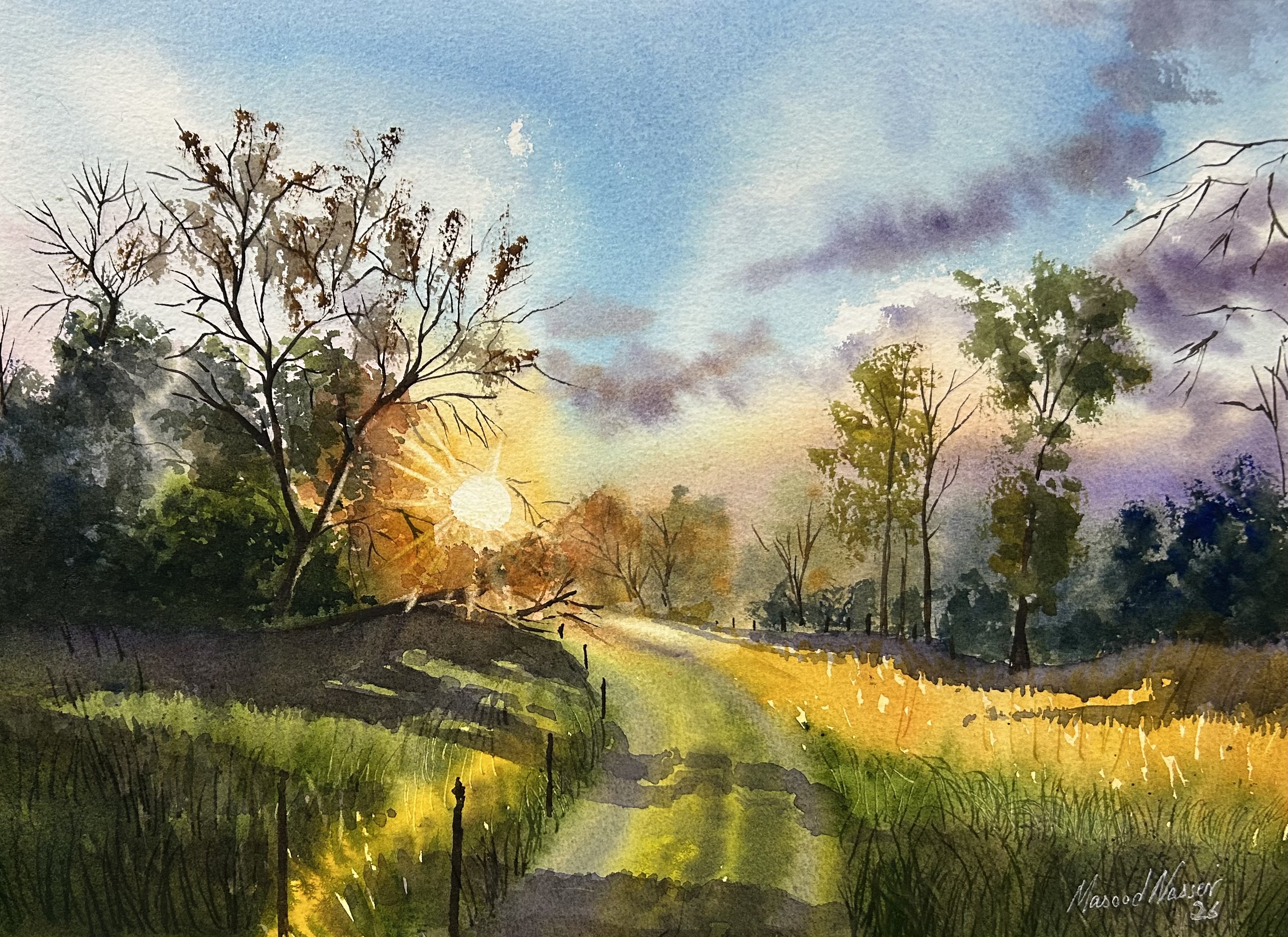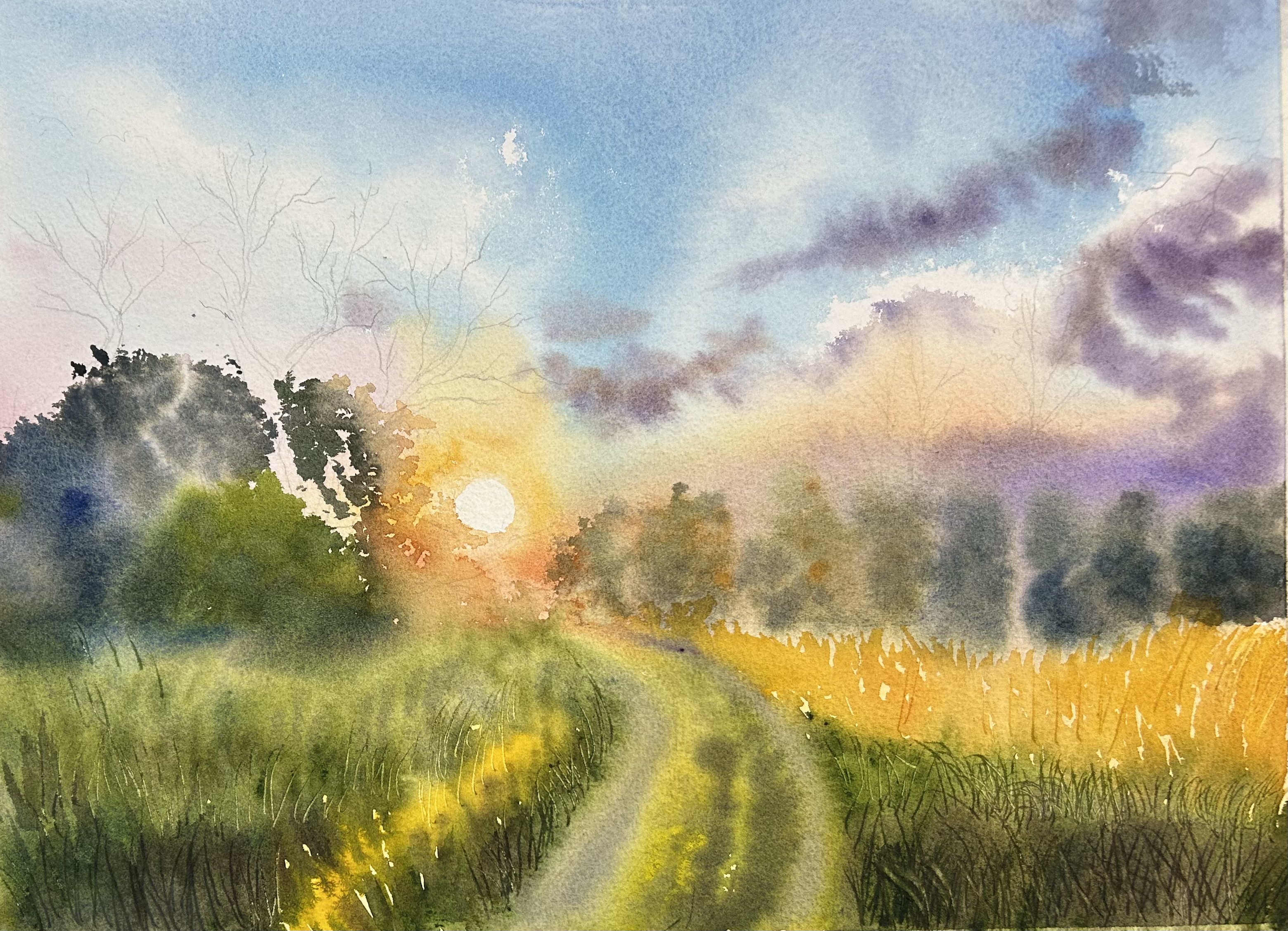 The sun likes to play hide and seek, peeking though a cluster of trees, sometimes illuminating part of the fields as shown in this atmospheric Watercolor painting that I created
